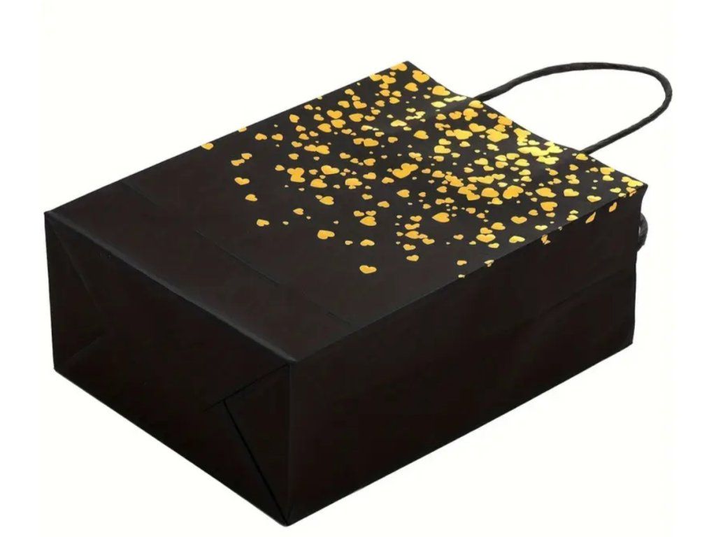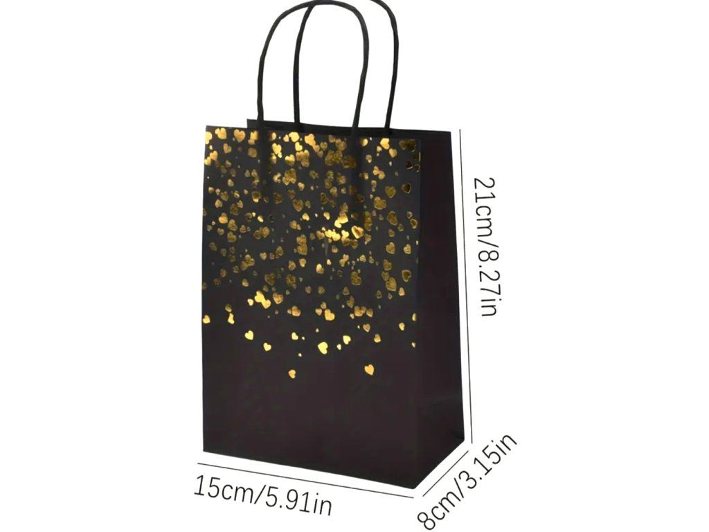 Elegantní papírová taška v černém provedení se zlatými srdíčky dodá každému dárku výjimečný nádech. Praktické papírové uši zajišťují pohodlné nošení a taška je ideální pro drobné dárky, které si zaslouží být předány s noblesou a stylem.